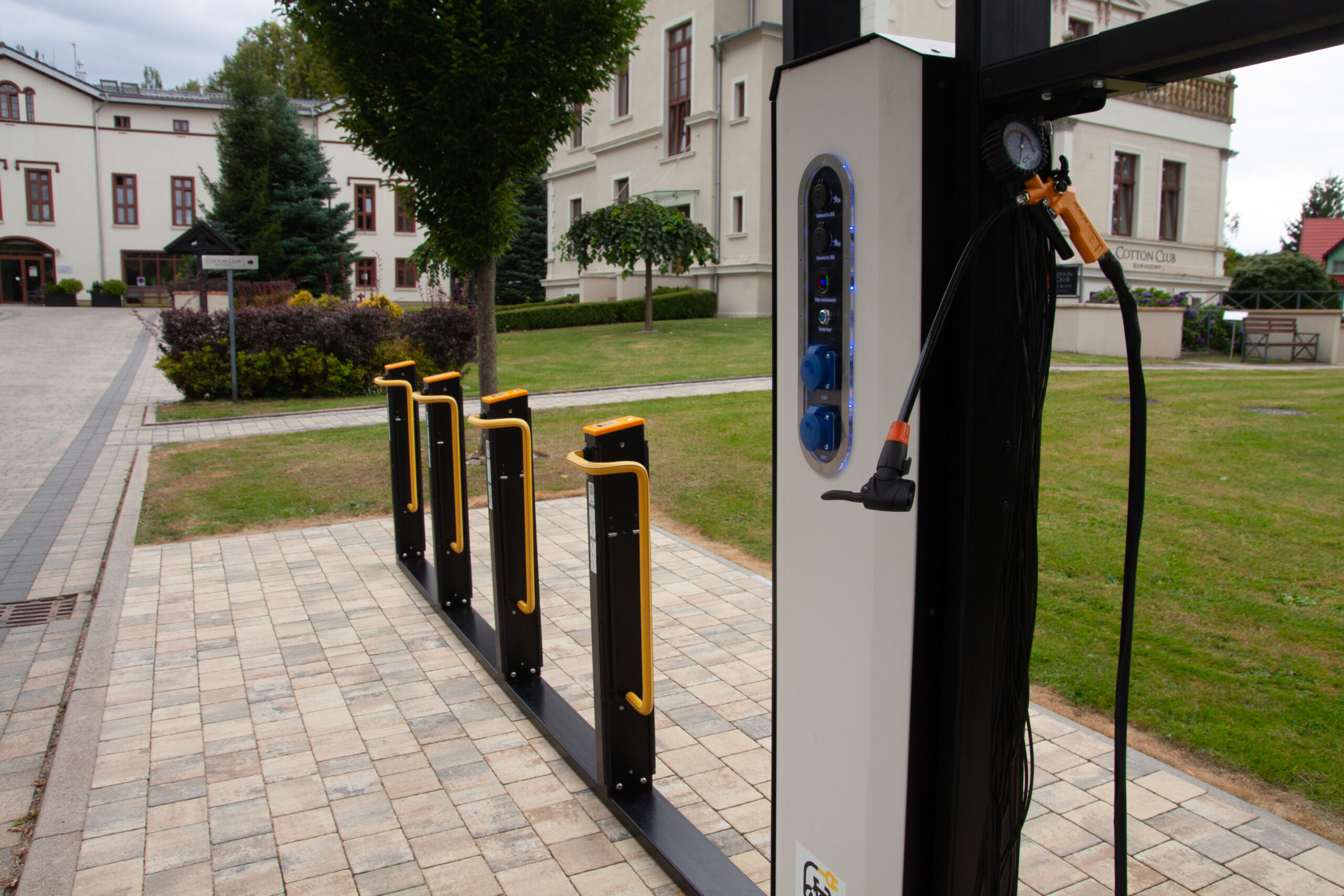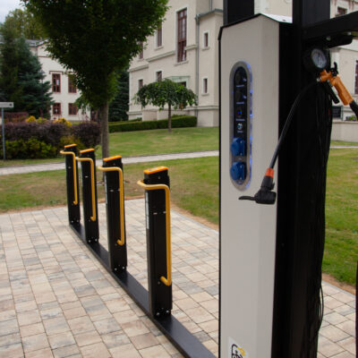 Tak. Standardowo stacje mają gniazda 230 V AC do ładowania rowerów elektrycznych oraz szybkie porty USB dla urządzeń mobilnych (telefony, lampki, nawigacje itp.).