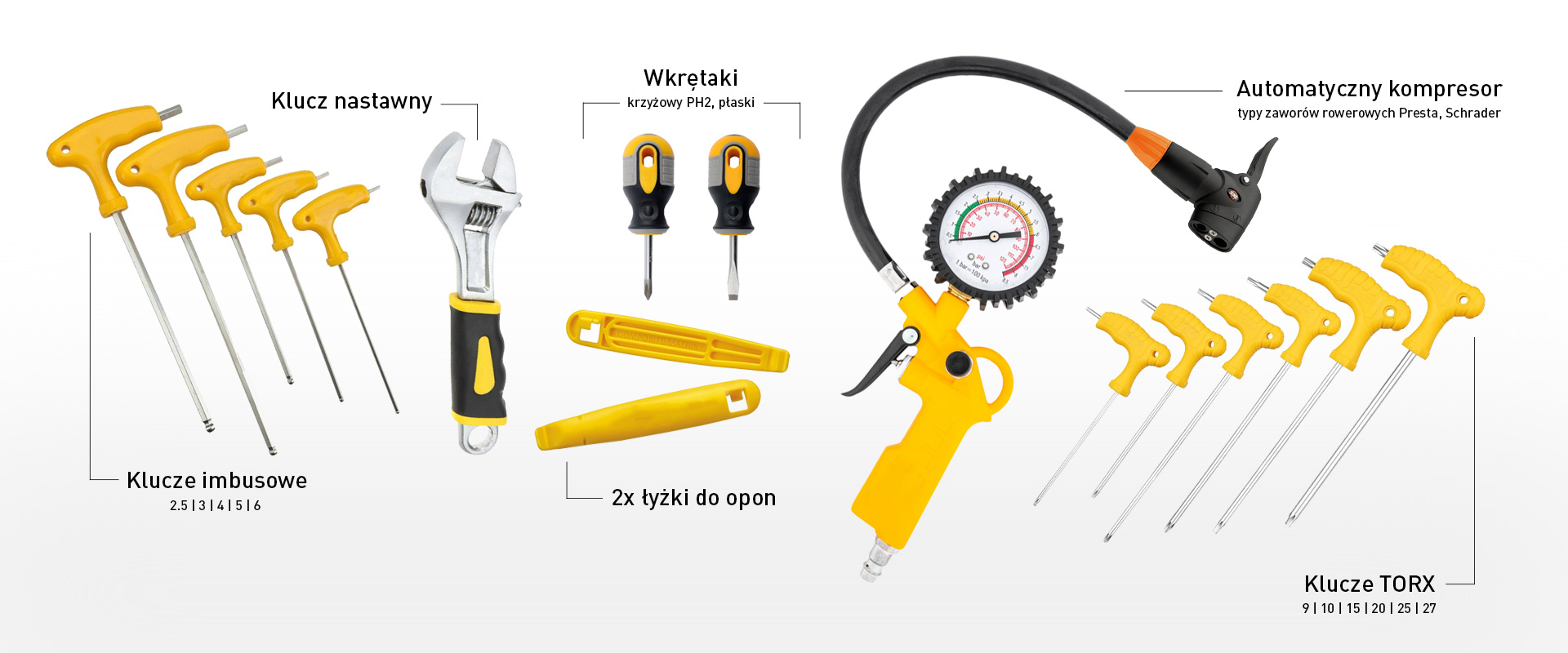 klucze imbusowe 2,5, 3, 4, 5, 6, 8, klucze TORX, T9, T10, T15, T20, T25, T27, wkrętak płaski