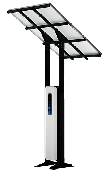 Wiata solarna – z 8 stanowiskami (4L+4P w linii) – Panele: 4×415 WPi • Bateria: 4×80Ah 12V • Gniazda 230V: 4× • Konstrukcja: stalowo‑aluminiowa, cynkowana, malowana proszkowo • Kolor: czarny mat RAL 9005 / biały mat RAL 9002